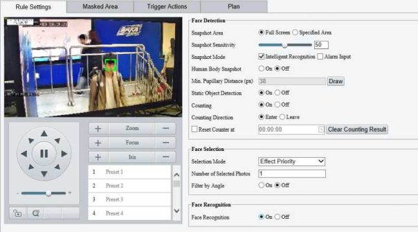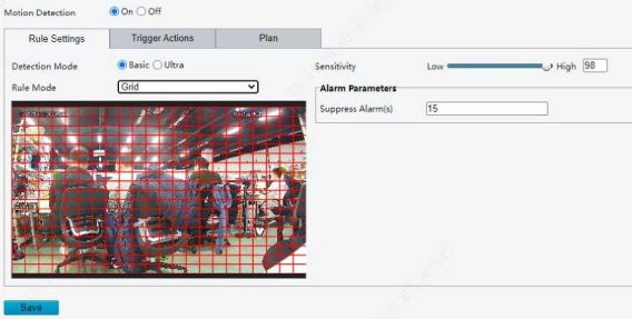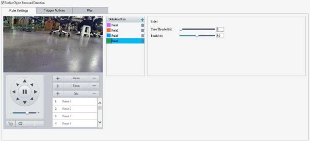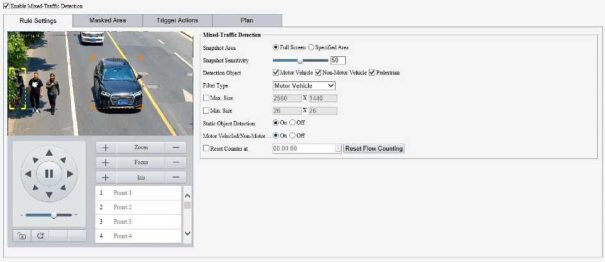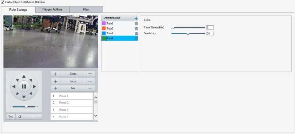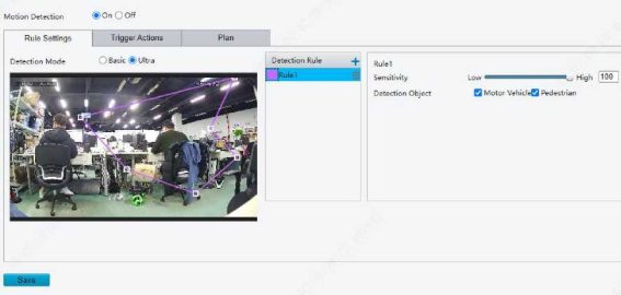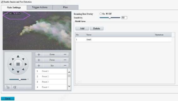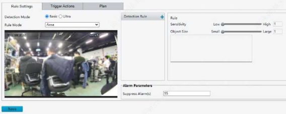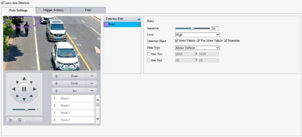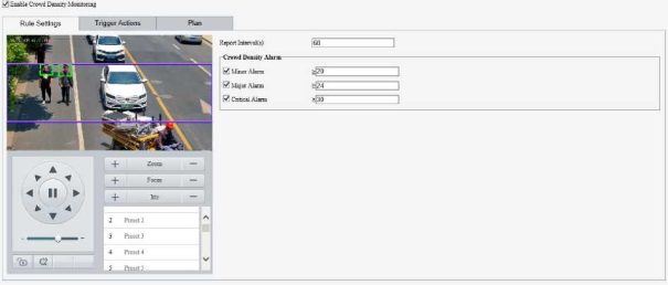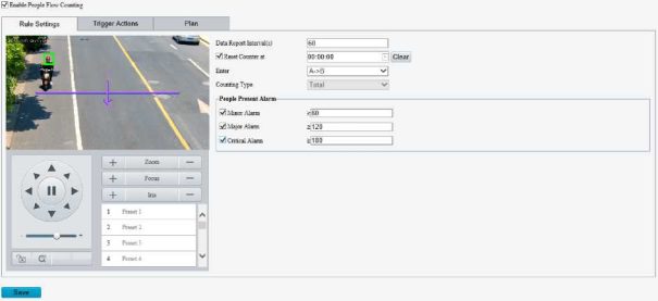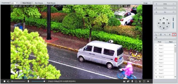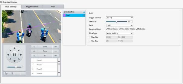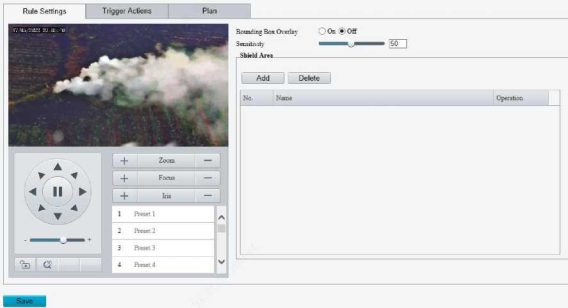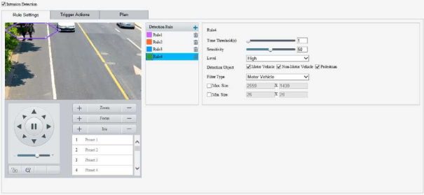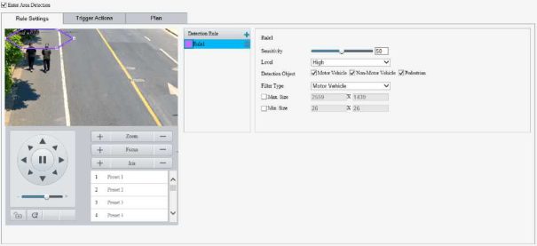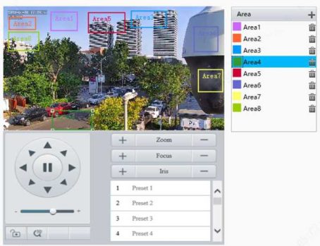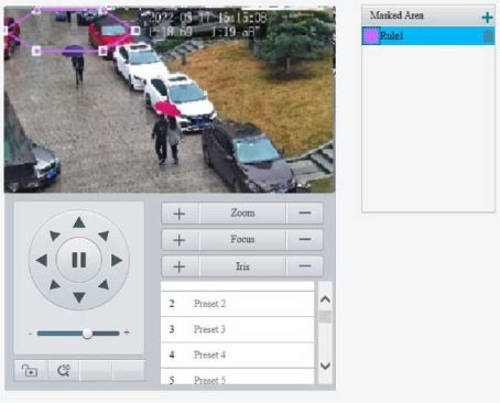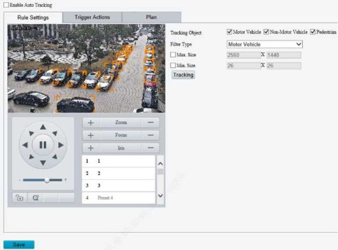 Enable perimeter protection (see Smart), then the camera can automatically detect moving objects in the detection area, and simultaneously track and zoom in on 5 objects that have triggered the alarm rules until the objects disappear.