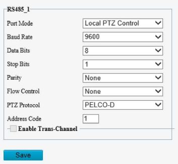 Set the PTZ address code. NOTE! This parameter is configurable only when Port Mode is set to PTZ Control and PTZ Protocol is set to Local PTZ Control. |