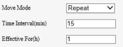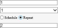 Repeat: You need to set the Effective For and Time Interval parameters. The Effective For parameter sets the duration of the Repeat mode (1 to 24 hours), and the Time Interval parameter sets the interval between two wiper movements (1 to 60 minutes). NOTE! If Time Interval is set to 60 minutes and Effective For is set to 1 hour, then the wiper works once at the last minute and then stops. Only integers are allowed. |