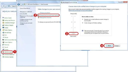 Before you access the camera, it’s recommended to set User Account Control to Never notify as shown below.