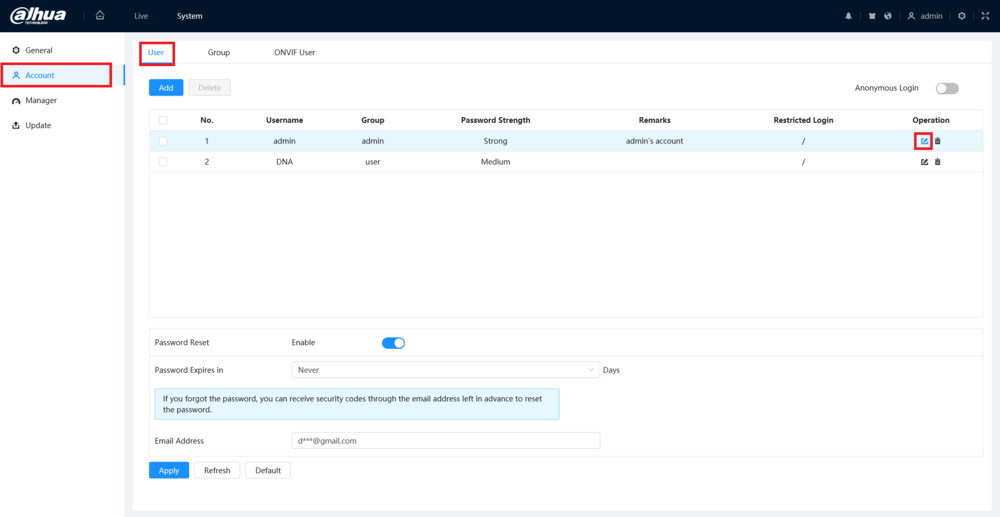 Reset via Password Recovery in DMSS