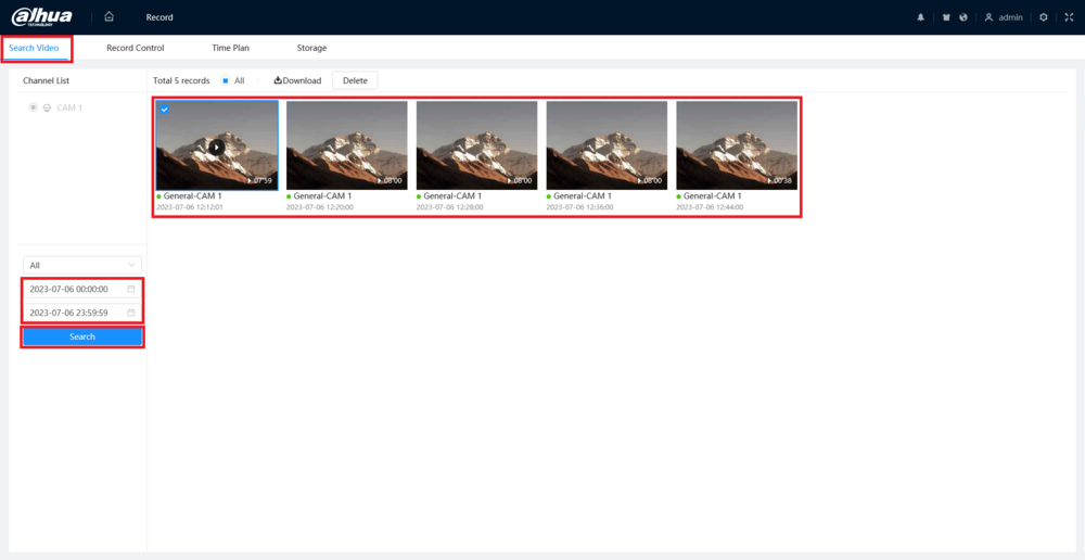 All the recorded footage on the SD card in the time range will appear.
