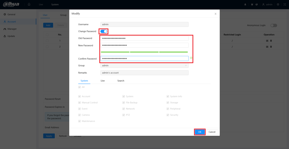 DAHUA IP Camera 5.0 UI Setup, This guide will show you how to modify an account’s password on an IP Camera with the 5.0 User Interface. Please remember to change the passwords on all of the accounts to insure maximum security. Also, to ensure a higher level of security please use passwords with these requirements: