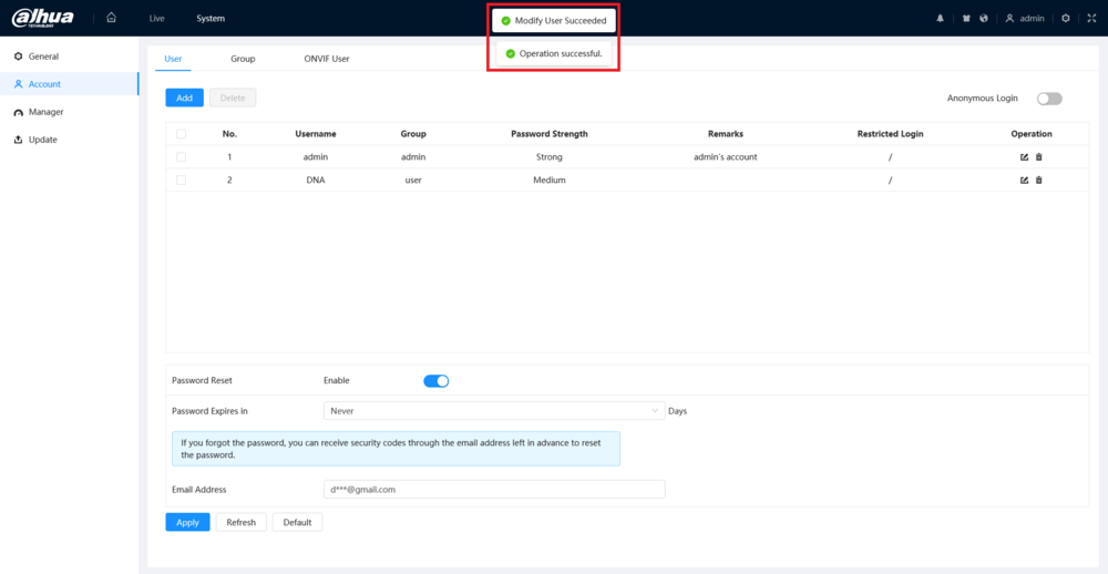 5. Once the new password is successfully changed, you will see “Modify User Succeeded” at the top