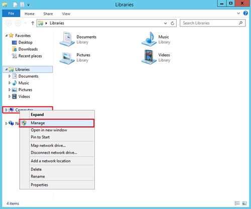 1. Log onto your Windows Server 2012 machine and launch the file explorer. Right click on Computer and select Manage.