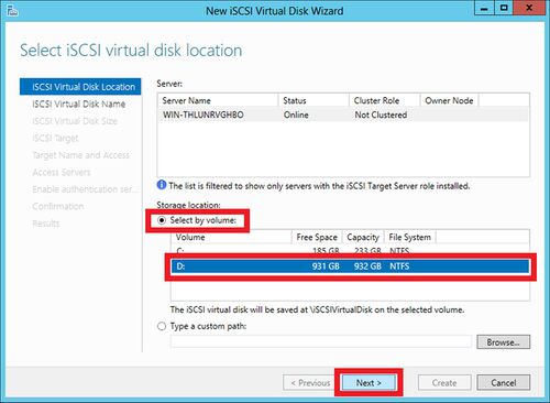 5. Select the volume (or disk) that the virtual drive will live on and click next.