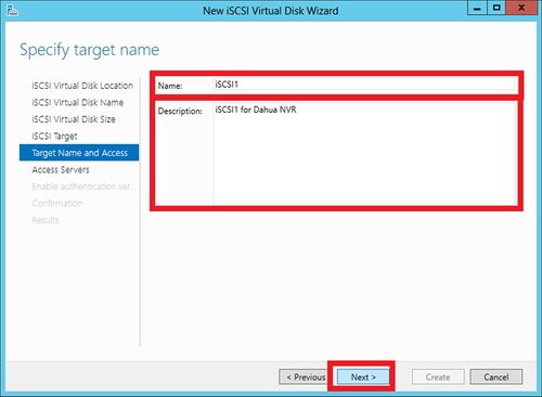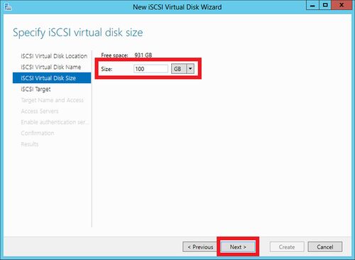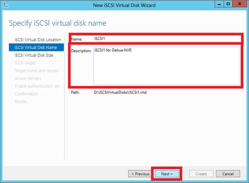 7. Define the size for your iSCSI Virtual Disk (must be above 32gb to work with Dahua NVR’s that support iSCSI), then click next.
