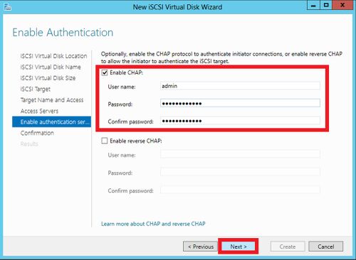 11. Now enable CHAP and enter a username and a password of 12 characters, then click next.