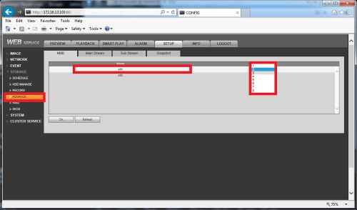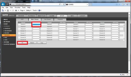22. Click the other tabs (main stream, sub stream, or snapshot) to configure where each channel will be saved to.