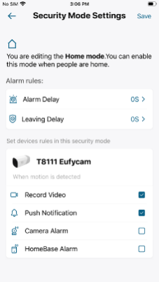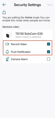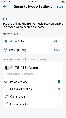 — Tap the Security button at the lower right corner of the main page and find your camera’s security mode settings. Set your camera to the Home mode and enable Record Video and Push Notification under the Home mode. Tap Save to save settings.