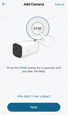 1. During the setup process, please make sure you have pressed the eufyCam or eufyCam E SYNC button for at least 2 seconds until you hear the beep. If you don’t hear the beep and the LED is off, please charge the battery.