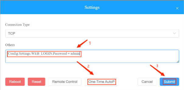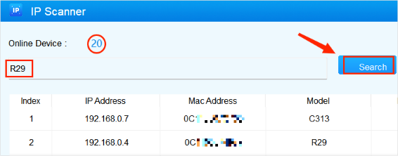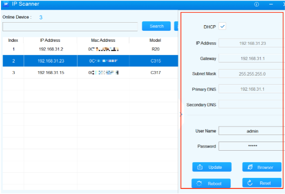 IP scanner allows you to search the device IP address(es) and to perform targeted device reboot, reset, network setting, etc.