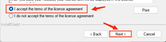 b. Check to accept the terms of the license agreement, and click Next.