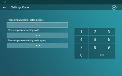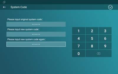 System code is used to enter “More Interface”, to adjust the password:Â More>Settings>More, input the default system code “123456”, tap System Code, input the original system code and new system code.