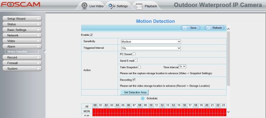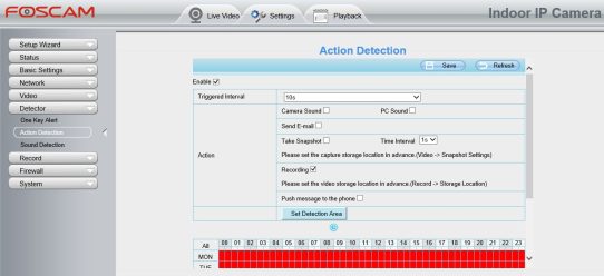 Note: Some Foscam user interfaces may slightly differ from others depending on your camera model. For example, your interface may have “Motion Detection” under “Alarm”. Another version of the interface may have Action Detection under “Detector”, as seen below.