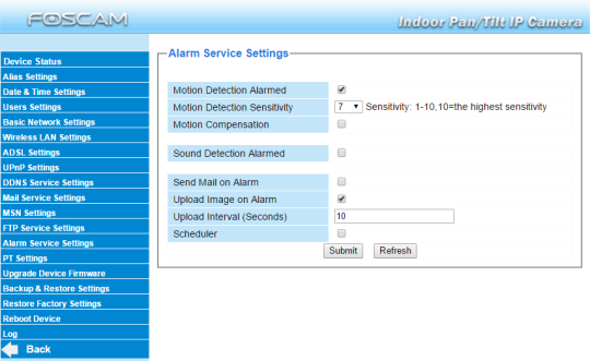 In the case of the older MJPEG cameras you only need to add the Alarm Service Settings. Select “Motion Detection Alarmed” and “Upload Image on Alarm”. In terms of the Sensitivity and Upload Interval that is up to you. Play around with these numbers for your motion detection needs.
