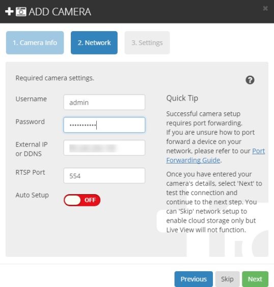 You’ll select a Foscam camera and model as usual, then at the network step turn off Auto Setup. You’ll be asked either for your RTSP or HTTP port depending on the camera model. Don’t forget to port foward your camera.