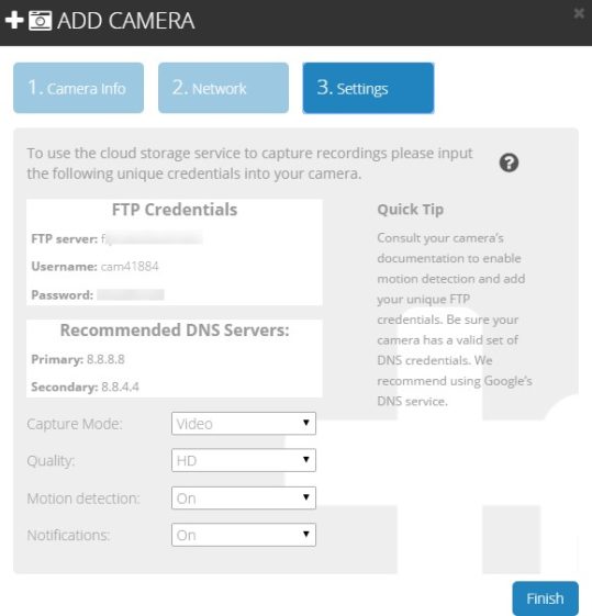 Once your done the add camera wizard will give you the FTP credentials which you’ll use later. Don’t worry if you lose these, you can always bring this up later in your camera menu right on the Timeline.