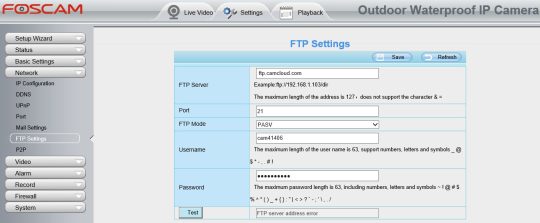 Under Network, click on FTP Settings. This example is for typical Foscam H.264 cameras.