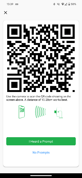 When you select ‘Next’, the app will display a QR code to you. Point the camera 15-20cm away from the QR code, directly facing the screen, and the camera should register it and say ‘Connect router’. When it says this, tap the ‘I Heard a Prompt’ button.