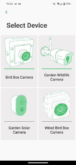 Select the type of camera that you have from the grid shown, for wired setup it will either be Garden Wildlife Camera or Wired Bird Box Camera.
