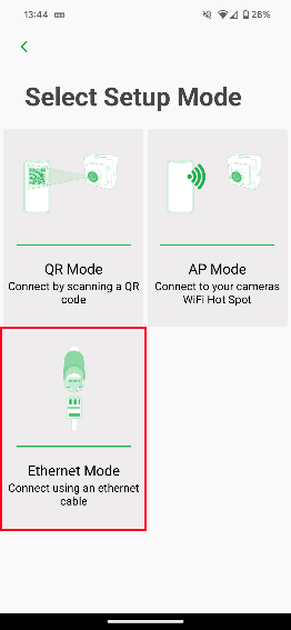 Now select Ethernet mode and follow through the prompts that show on the screen to connect your camera.
