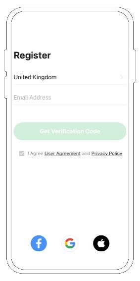1.Enter your email address, tick ‘I Agree User Agreement and Privacy Policy’ then tap ‘Get Verification Code’. If you would like to use your Google or Facebook account to sign up you can do so by tapping the relevant icon at the bottom of the page.