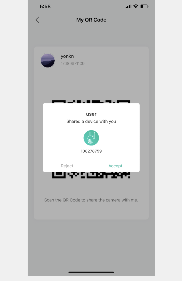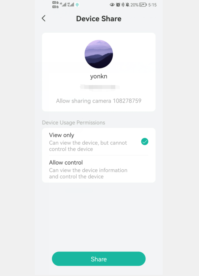 Open your family’s APP, show your family’s QR-Code, and scan it. Share the camera with your family. You can set two Device Usage Permissions, One is View only means your family or friends can view the device, but cannot control the device; and the other is Allow control means your family or friends can view the device information and control the device