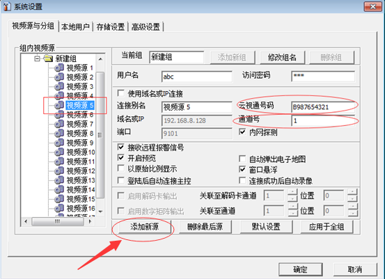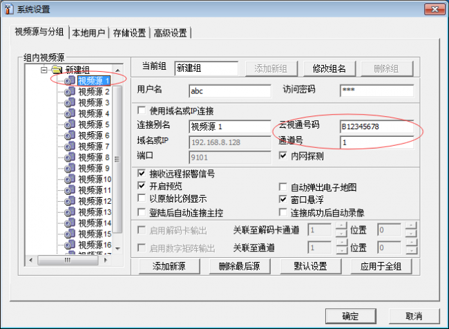 To add multiple video recorder equipment, click login, click to open the system settings, the video source and group appear, select video source 1 , enter the first video recorder cloud view number, open video source 2 , enter the first cloud view number, and so on, N -way video recorder to the video source to fill N . Then when you start to input the cloud view number of the second video recorder, enter the cloud view number of the second video recorder on the video source N+1 , and the channel number is changed from the original N+1 to 1 . And so on. Take a case to illustrate, add a 4- channel video recorder and an 8- channel video recorder to CloudView . First add a 4- channel video recorder ( B123456789 ), and then fill the 4- channel video recorder into the video source 4 . Add 8 channel recorder ( B987654321 ), begins when the input 8 when the channel number Vision recorder cloud, the video source 5 inputs on 8 channel recorder cloud Vision number, fill the channel number from the original 5 into one . Input on video source 6For the cloud view number and channel number of 8- channel video recorder, the channel number is changed from 6 to 2 , and so on. No picture, no truth, the picture above.