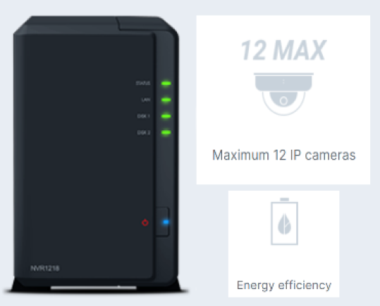 The Synology NVR1218 is a 2-Bay (Reaching a max. of 7 bays, with an Expansion unit) Network Video Recorder, able to support a max. of 12 IP camera channels.