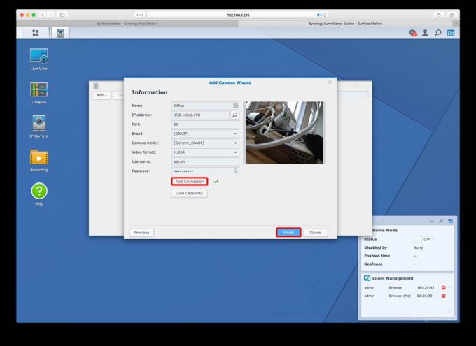 Step 12: Click the Test Connection button and if the test is successful you’ll get a green tick and a live shot from the camera, you can then click Finish and the camera will be added to your Synology NAS​