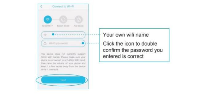 2. Input the CORRECT WiFi password of your router, if you input a wrong password you will not be able to connect it successfully. Click the eye icon to double confirm the password you entered correct