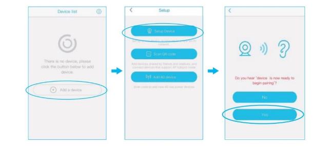 1. Click “Add a device” and then choose “Setup device”, click “Yes”, when you hear the following voice “ The camera is now ready to begin pairing”.