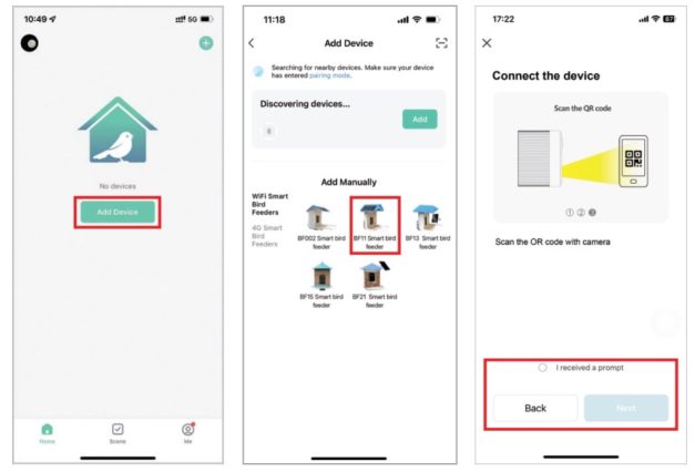 2. Open the Bird Lover App, click +, select your Bird Feeder Camera (you can choose one at random, the connection is the same), and then follow the instructions of the App.