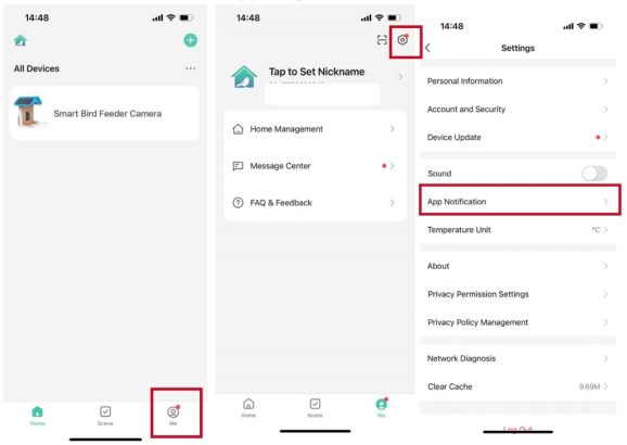 Click “ME” in the lower right corner, Click the settings button in the upper right corner,Click App Notification.