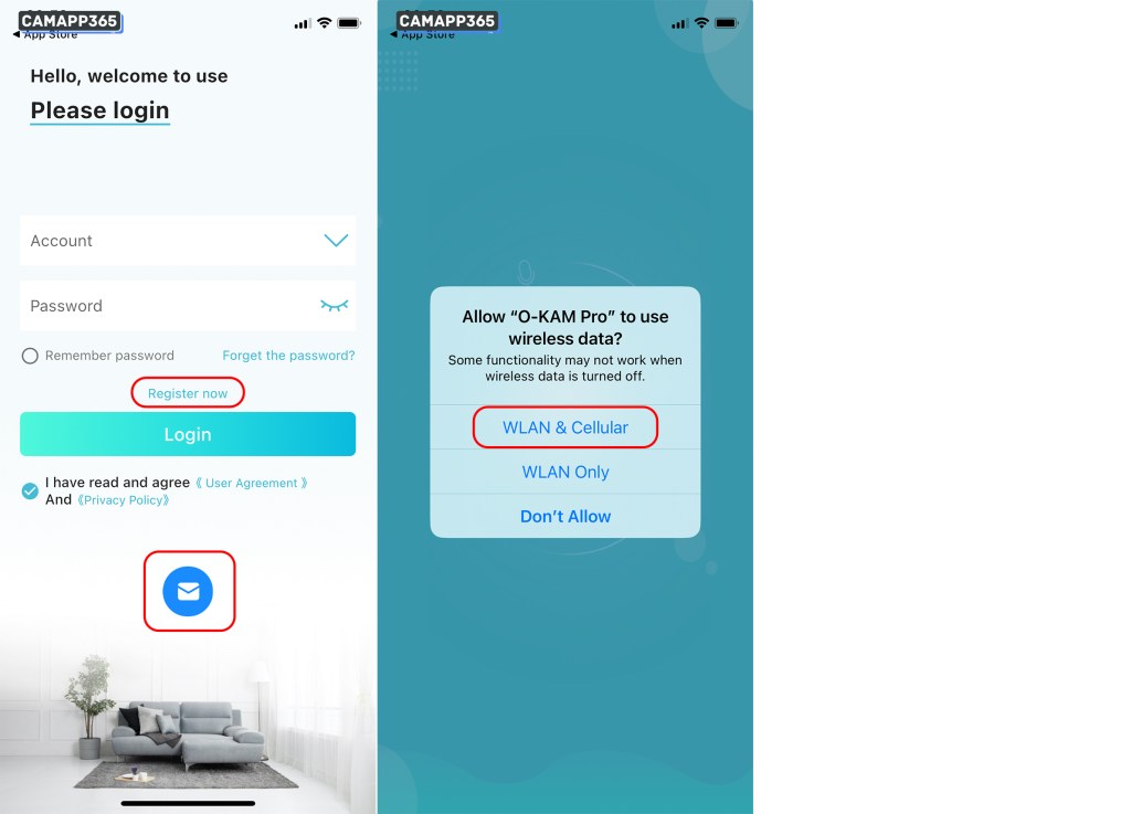 You need to register and login to O-KAM Pro APP to connect the camera, click Register now or email icon to register.