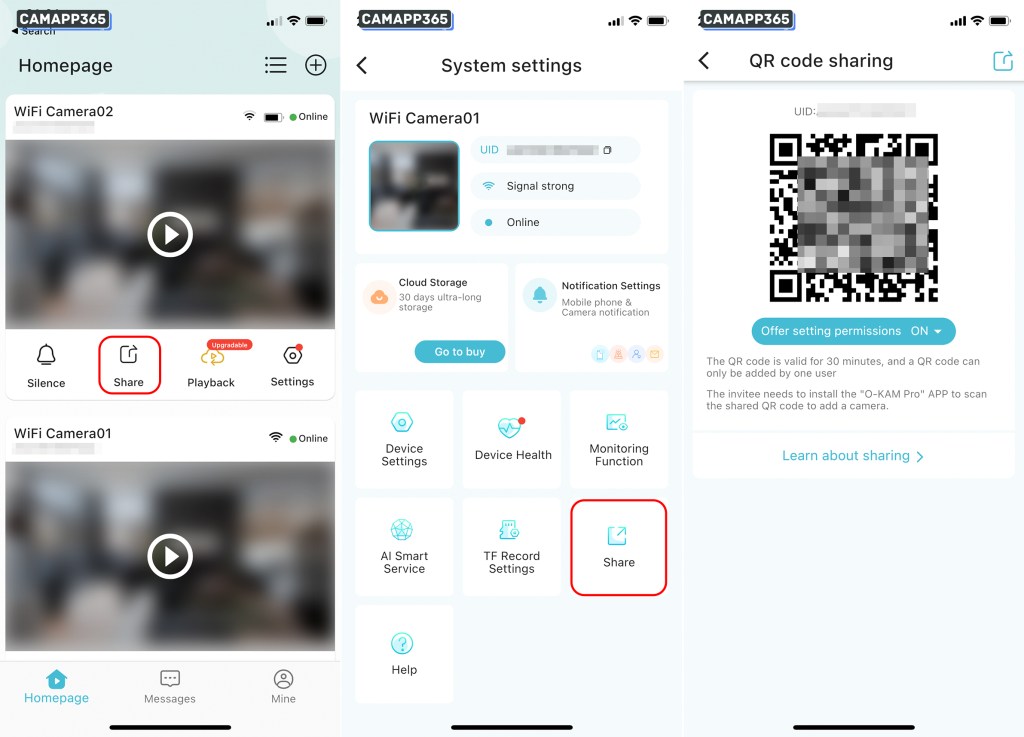 Once you have connected the O-KAM Pro camera, if you want your family or friends to use the camera as well, you need to share the camera with your friends via the Share function.