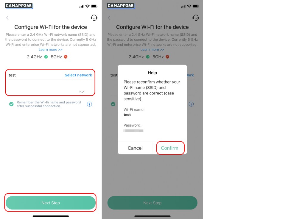 5. Confirm your Wi-Fi name and enter your password. Click Next step. Please note that the VicoHome camera only supports 2.4GHz Wi-Fi, double-check your Wi-Fi and password, then click Confirm.
