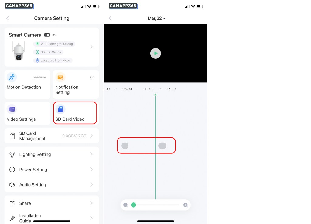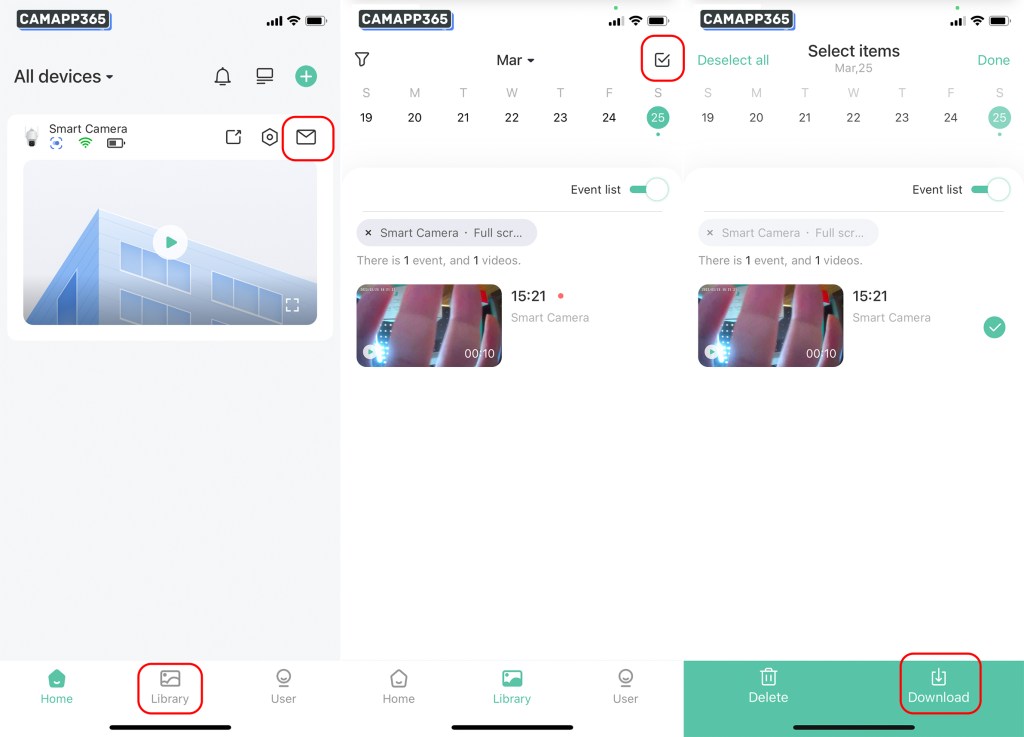 Click on the Library or “blank” icons to view alarm messages and click on a message to view a video. VicoHome cameras offer free cloud storage and recorded videos will be deleted after 7 days. If you have an important video, you can click “Download” to save it to your phone.
