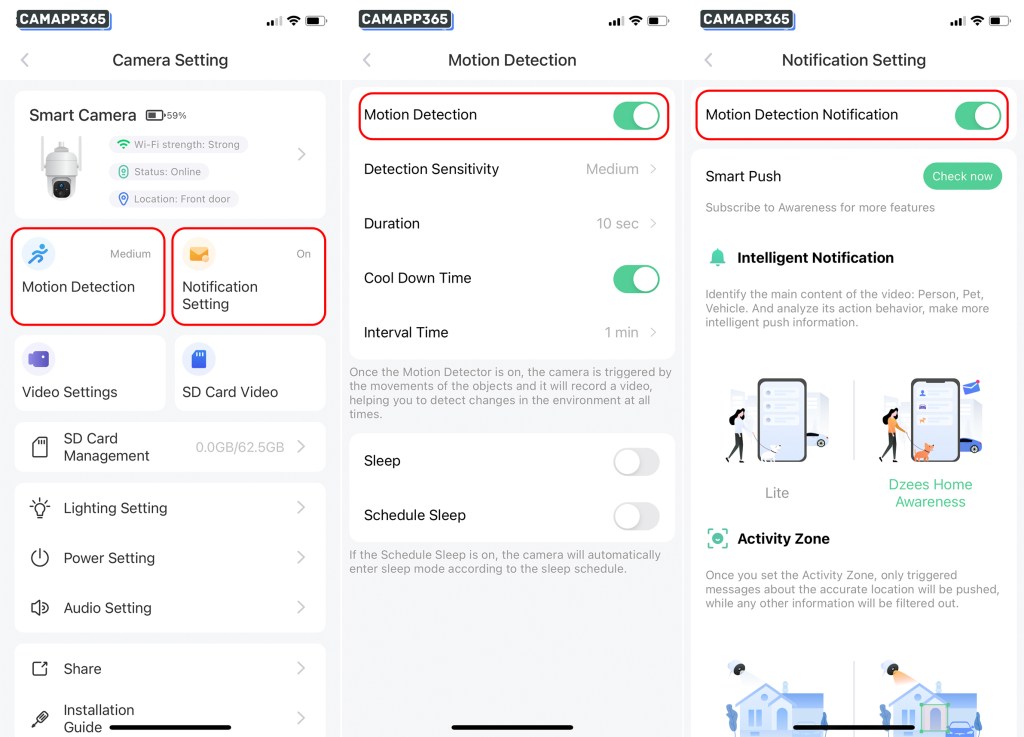 · Cool Down Time: Set the detection cool down time so that no further notifications are sent for one minute after a motion is detected.