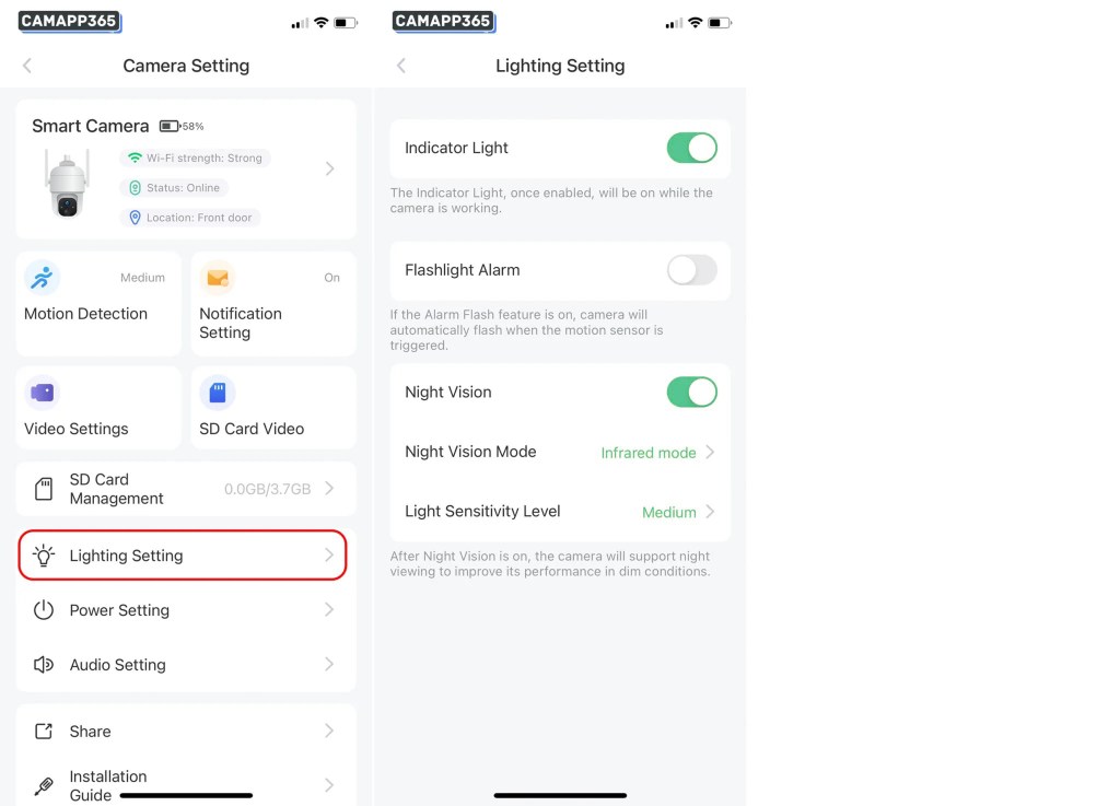 You can set the night vision function in Lighting Setting to improve the camera’s performance in dark environments.