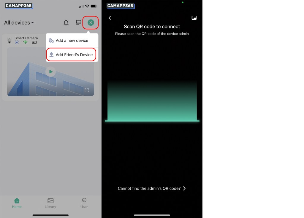 2. Invitees need to download the VicoHome App and sign in, then open the + in the top right corner, select Add Friend’s Device and scan the shared QR code to add the camera.