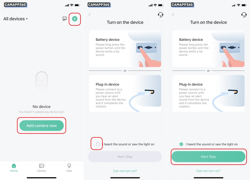 3. Tap on Add camera now or the + icon in the top right corner to link the VicoHome camera. Then, click on I heard the sound or saw the light on followed by Next Step.