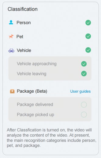 If you subscribe to the VicoHome Premium service, there are intelligent settings for Person, PetVehicle and Package.
