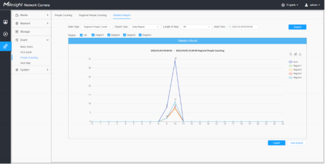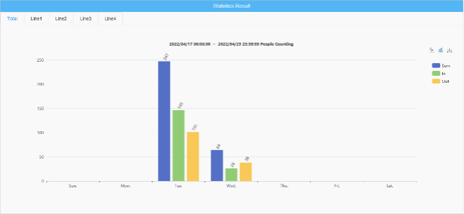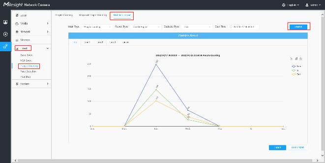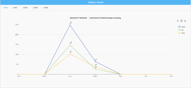 After a certain time of counting, you can start using the Statistics Report function. With this function, you can search by Statistics Types or Report Type. The search result supports Line Chart and Histogram, which could help users to study flow trend.
