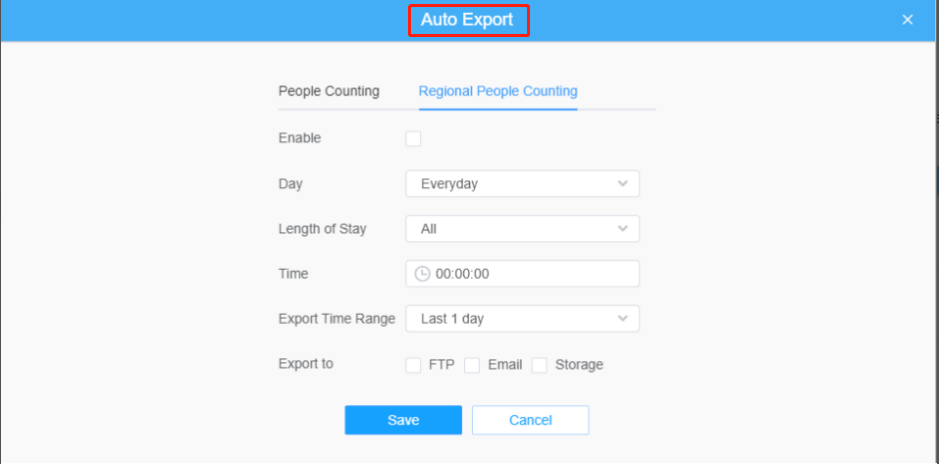 · Set the destination path of the automatically exported report. The report can be exported to FTP/ Email/Storage automatically as the form of an Excel spreadsheet according to the day, time and export time range you set. Then click “Save”.