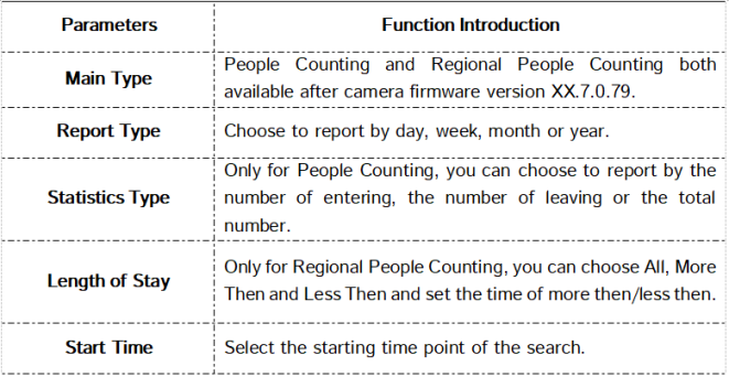 Search: Select Event→People Counting→Statistics Report in Configuration. Before click Search, you need to configure each parameter.