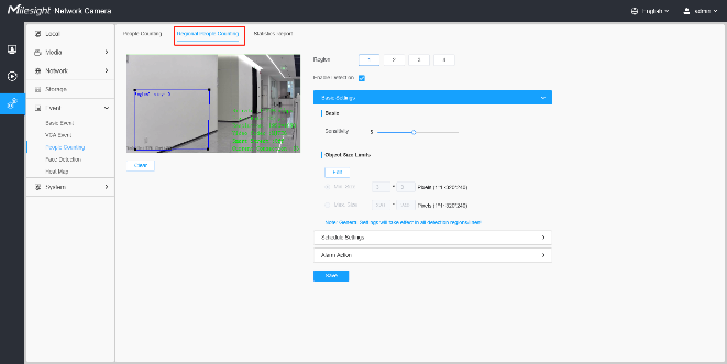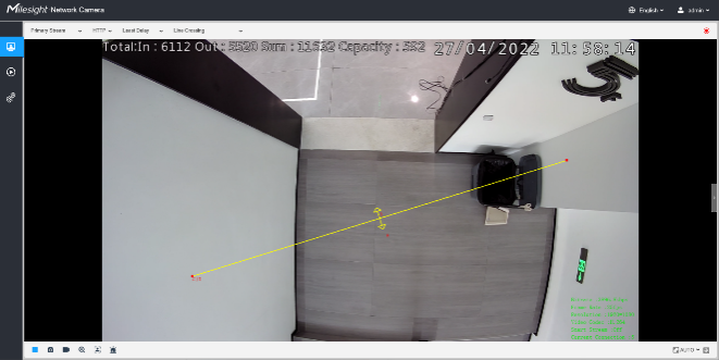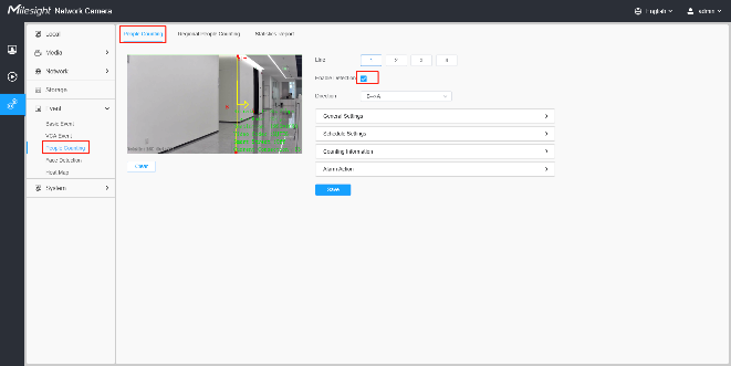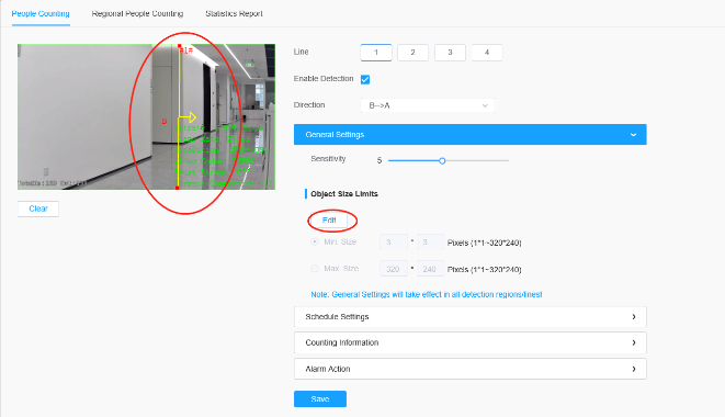 Step2: Draw a line(Up to 4 lines can be set). The direction of the arrow is IN. If necessary, you can also set Min and Max size limits of object to exclude abnormal targets.