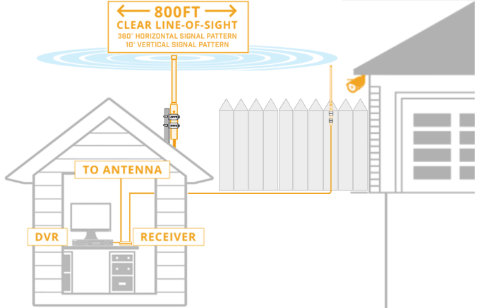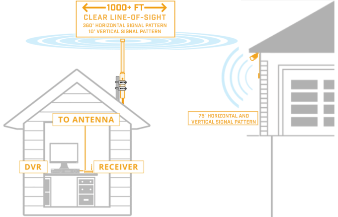 Connect one Directional Wireless Panel Antenna directly to the camera and one Directional Wireless Panel Antenna directly to the wireless receiver. To maximize signal strength, it is recommended to aim the two antennas directly at each other with a clear line-of-sight.