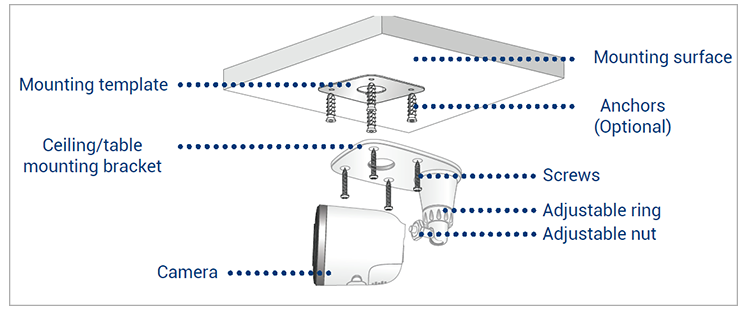 4.Attach the camera to the ceiling/table mounting bracket using the threaded insert at the rear of the camera. Rotate the camera clockwise until attached, then use the wrench to tighten the adjustable nut in place.